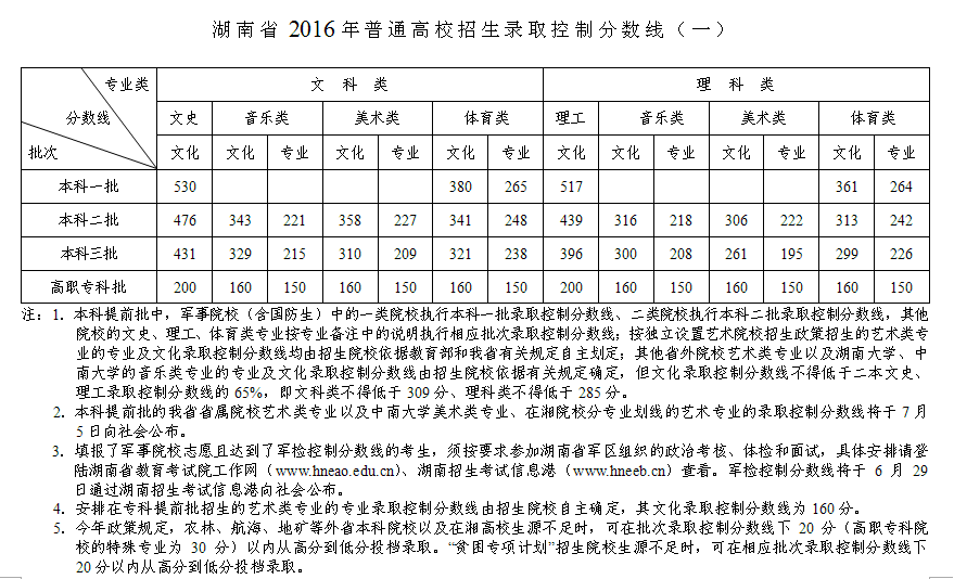 2016年湖南省普通高校招生錄取控制分?jǐn)?shù)線