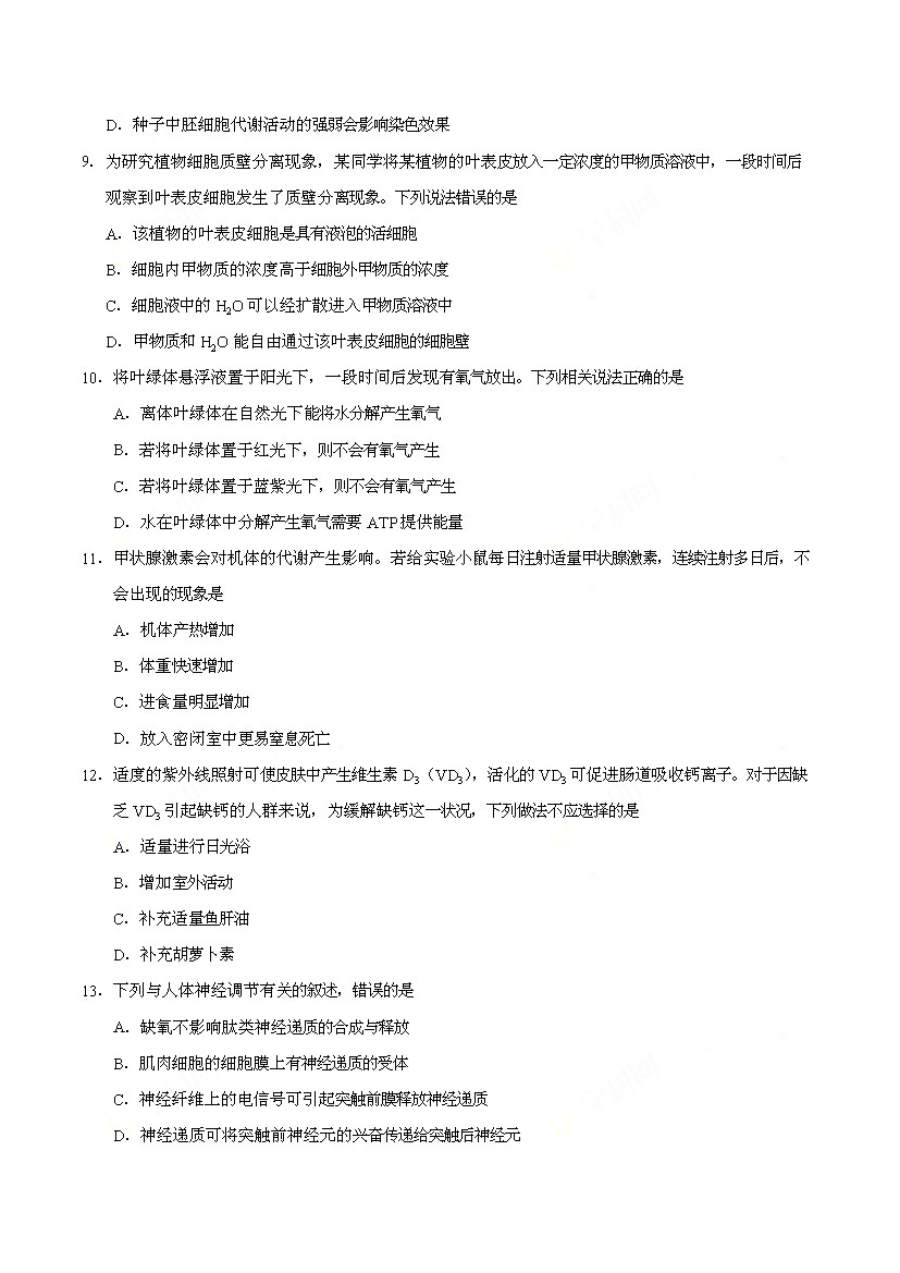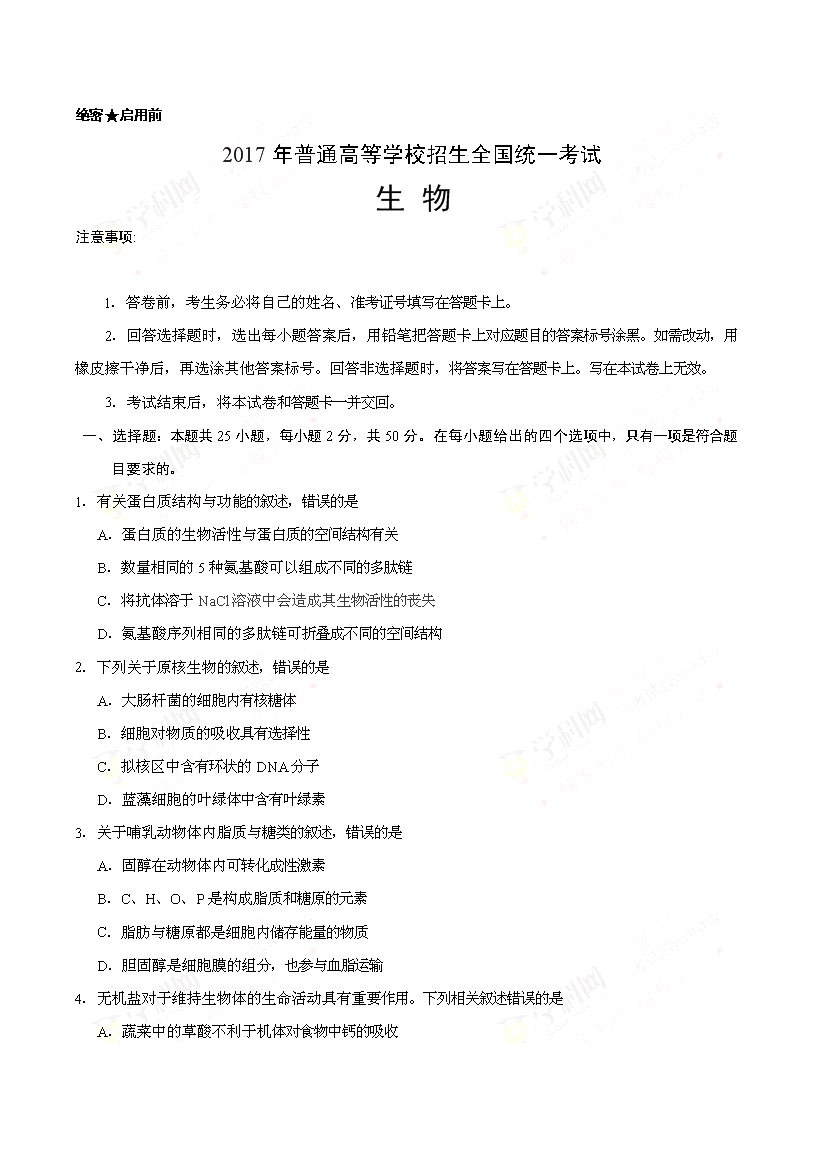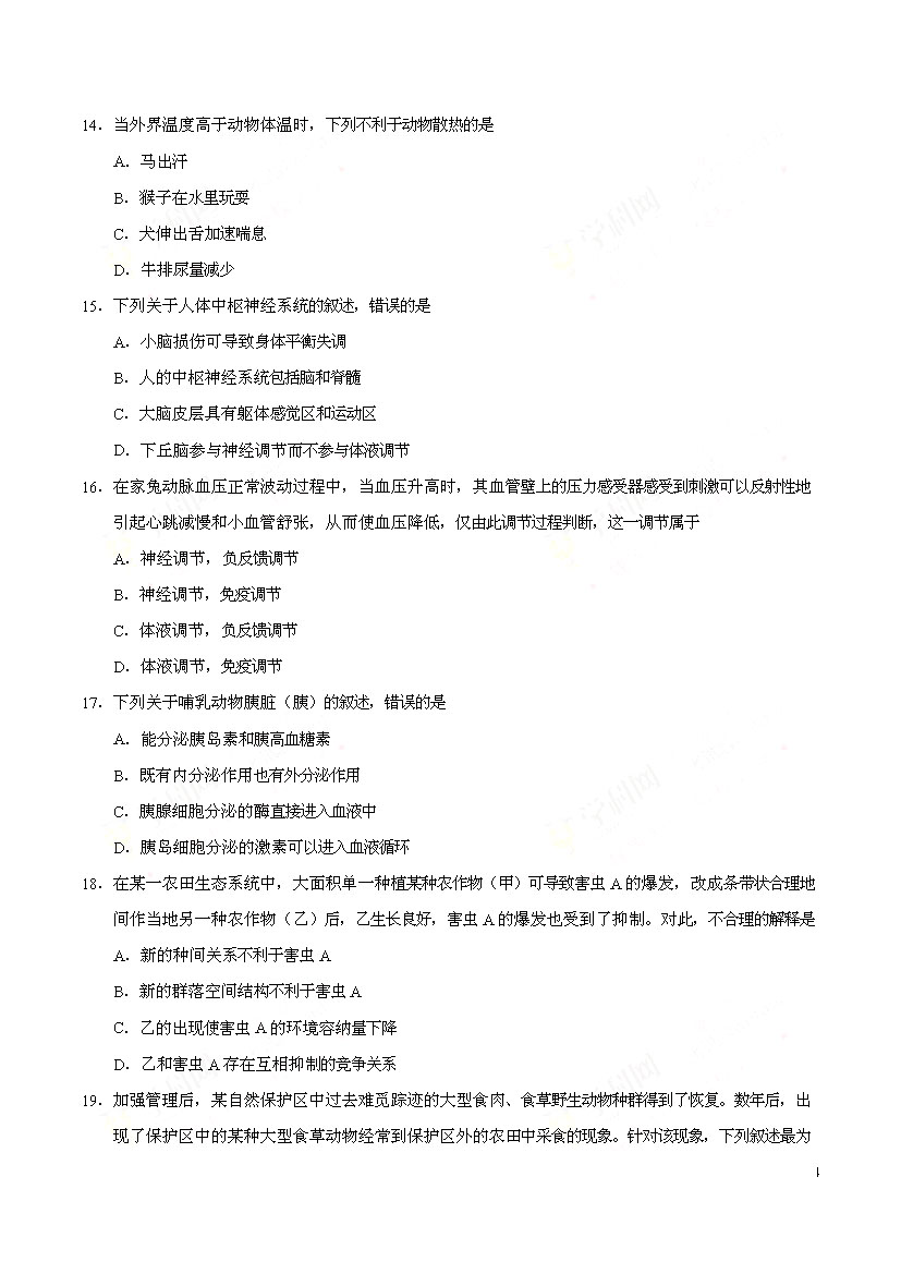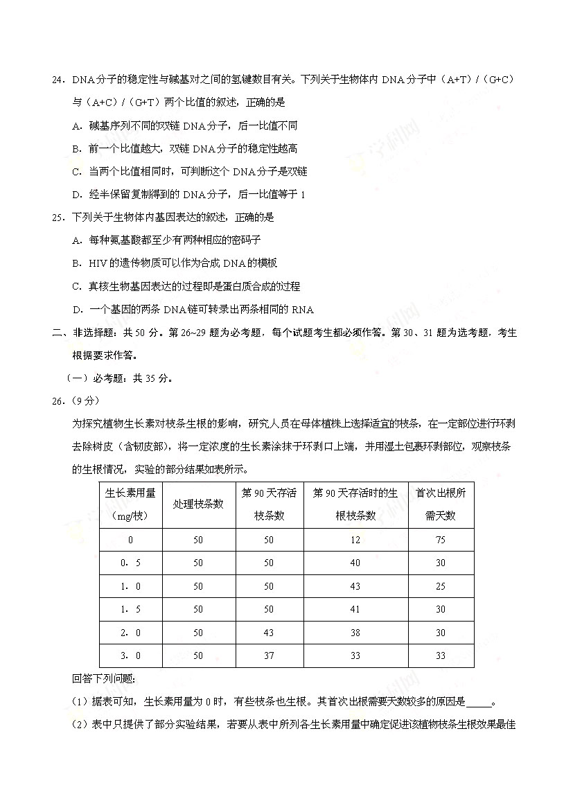 2017海南高考生物試卷(已公布)